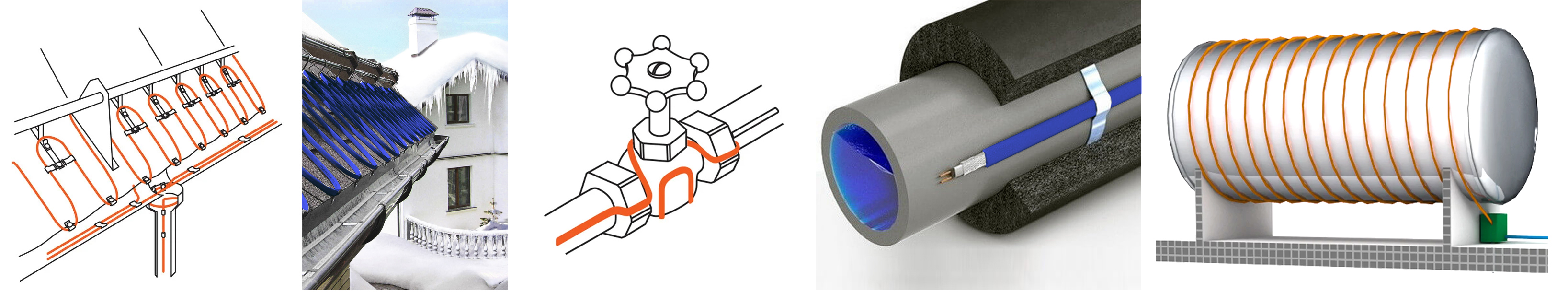 Обогрев водопроводов, Обогрев канализационных труб, Обогрев резервуаров и емкостей, Обогрев водостоков и желобов, Обогрев кровли, Промышленный обогрев