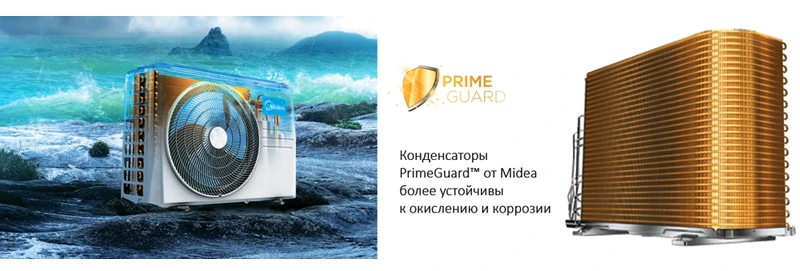 Система PrimeGuard™ от Midea — защита теплообменника, обеспечивает усиленную устойчивость к окислению и коррозии, по сравнению с обычными ребрами конденсаторов, продлевая срок службы.