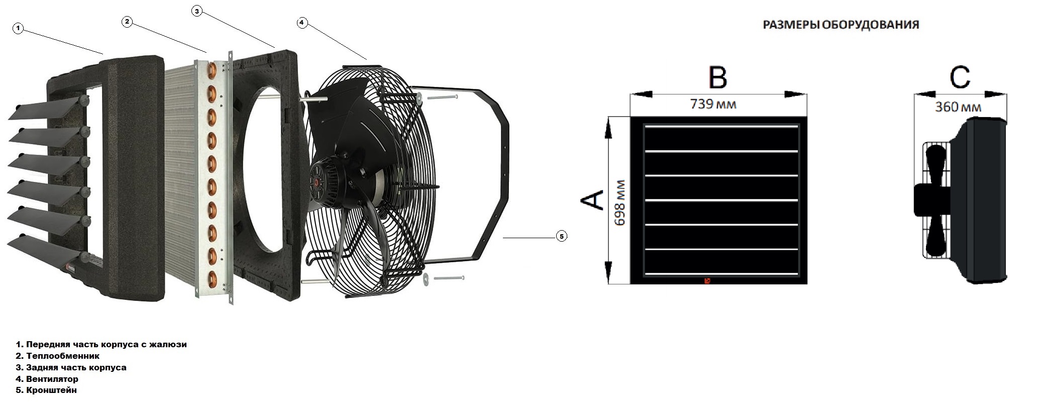 Влагозащищенный осевой вентилятор – изготовлен из стали, прогоняет воздух через теплообменник. Поворотный кронштейн – входит в комплект поставки. Необходим для монтажа калорифера на стену или потолок с возможностью вращения.