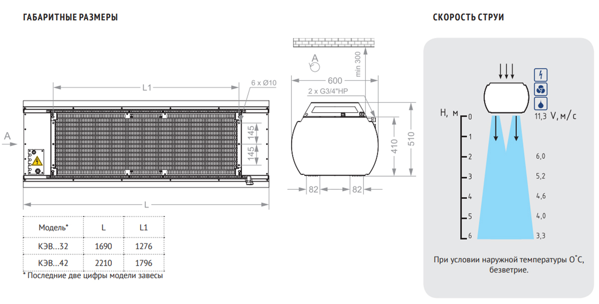 Эффективная длина струи может служить оценкой допустимой ширины или высоты проема, который защищает завеса. При вертикальной установке завес с двух сторон проема, значение, следует понимать как полуширину. Параметр указан только для "мягких" наружных условий, т.е. температура воздуха не опускается ниже 0 °С, а скорость ветра не превышает 1м/с, приточно-вытяжная вентиляция сбалансирована. Любое ужесточение условий уменьшает эффективную длину струи на 50%.