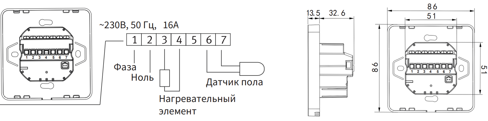 Схема подключения и габаритные размеры: