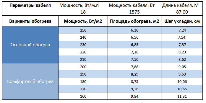 Самостоятельно высчитать какую площадь может обогреть секция нагревательного кабеля, нужно мощность секции разделить на вид обогрева (комфортный, основной или холодных помещений) и получим количество квадратных метров обогрева пола.