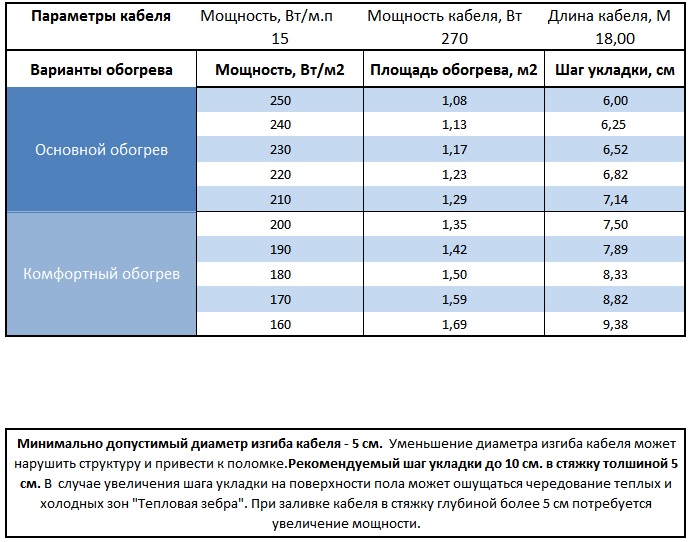 Самостоятельно высчитать какую площадь может обогреть секция нагревательного кабеля, нужно мощность секции разделить на вид обогрева (комфортный, основной или холодных помещений) и получим количество квадратных метров обогрева пола.